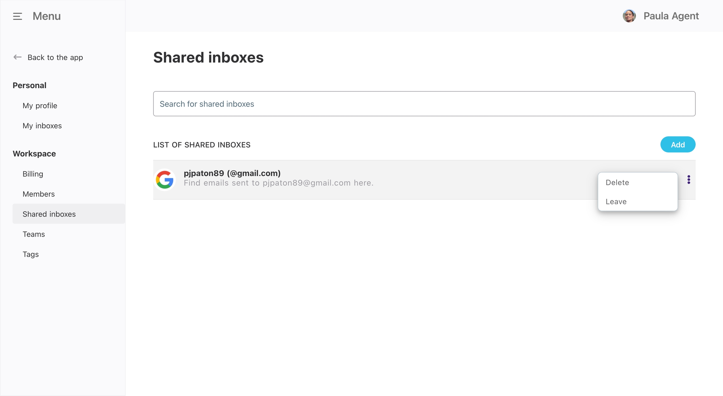 Deleting a shared inbox can be done in the shared inbox settings. Navigate to the shared inbox by clicking settings (bottom left hand side of your dashboard) - shared inboxes and then click on the shared inbox you would like to delete, click on the three dots to the right and click on the "Delete" option as shown below.