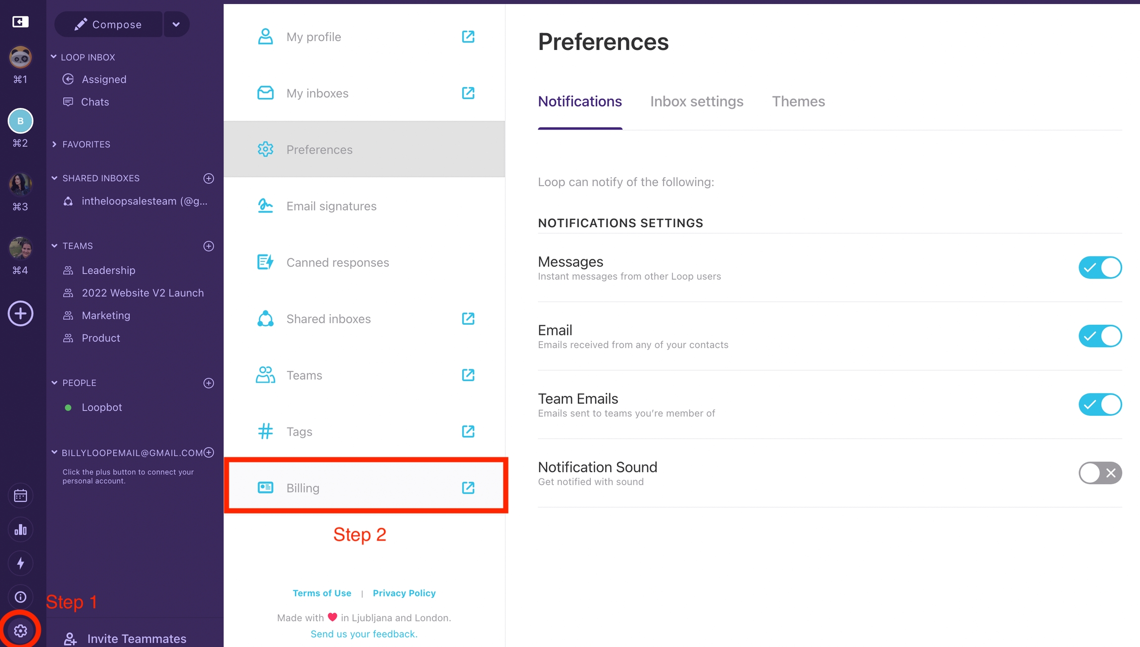 From your Loop dashboard - go to settings (found in the bottom left hand corner) and then click Billing.