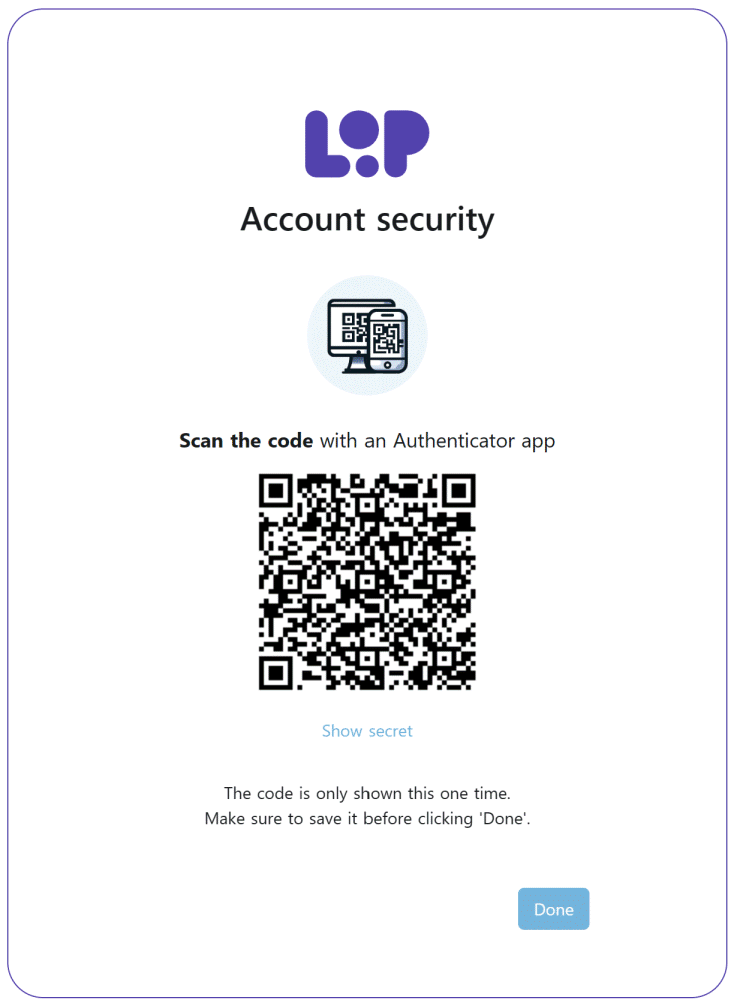 If you can't scan the QR code, click "Show secret" to see a code, the TOTP secret, that you can manually enter in your TOTP app instead
