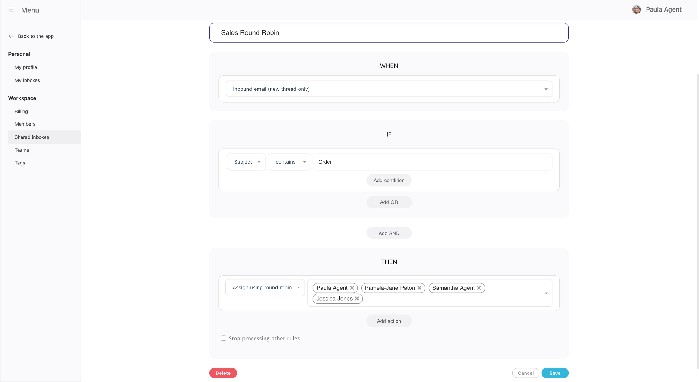 Head over to your rules (settings -> Shared Inboxes -> Click the inbox you need -> Rules) and add a new rule.