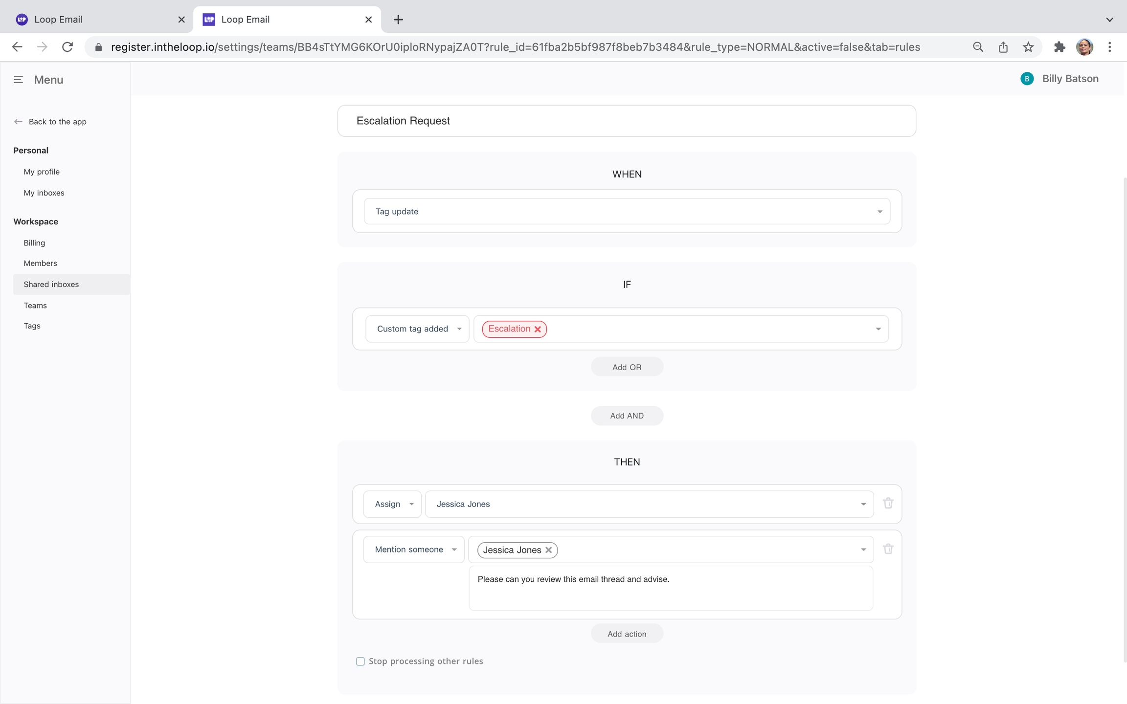 In the example below, we have created an escalation workflow. When an email needs to be escalated to a manager, the only action that needs to be taken is the tag #escalation is used. This triggers a rule which assigns the email to the manager with a short note asking them to review.